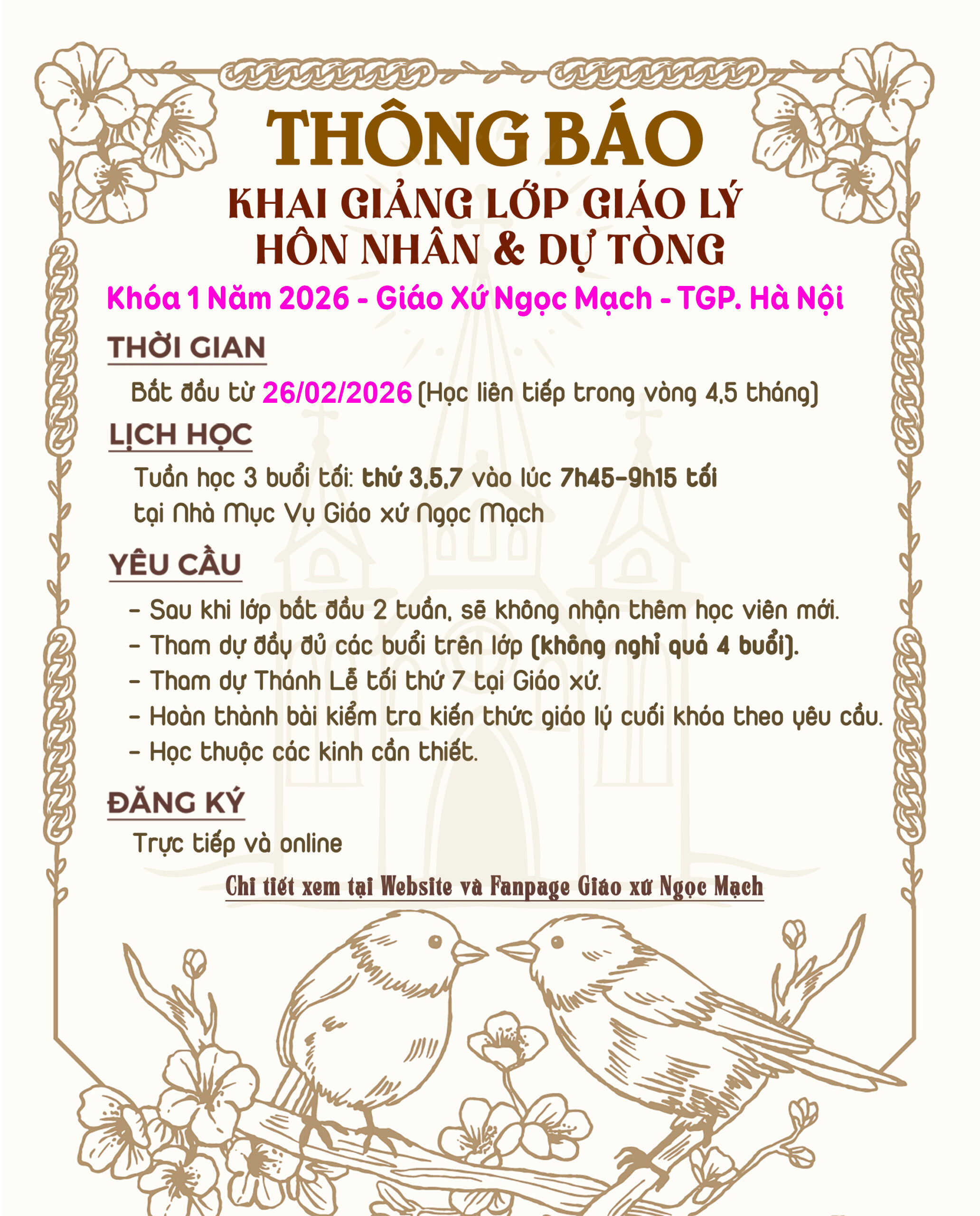 Giáo xứ Ngọc Mạch xin thông báo về việc mở lớp giáo lý Hôn nhân – Dự tòng khóa 1 năm 2026 như sau: